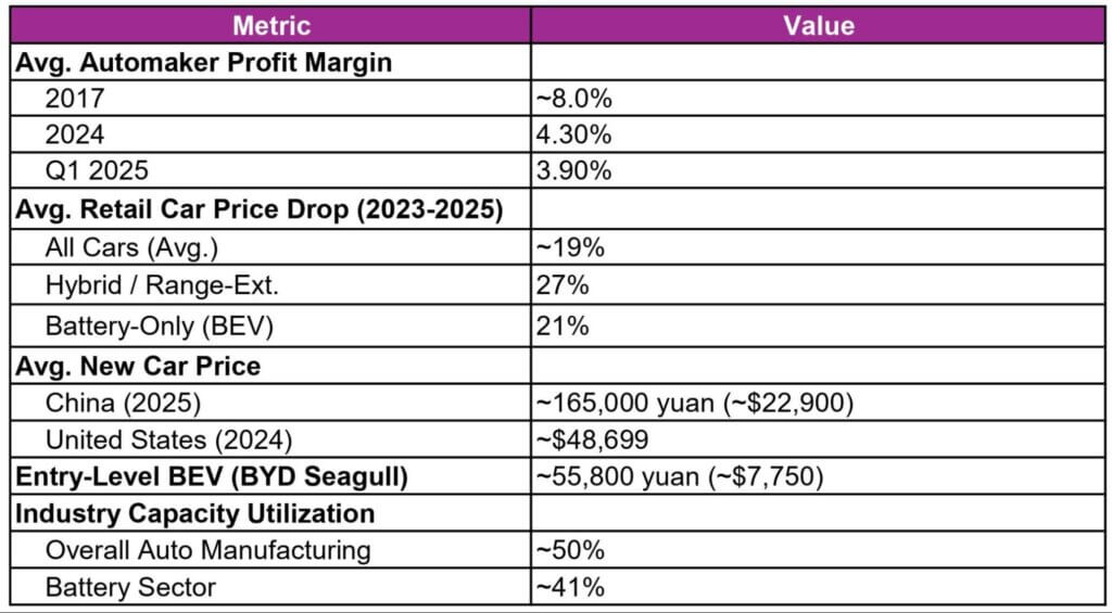 The most immediate casualty is profitability. As price cuts ripple through the market, margins have evaporated. By early 2025, the average profit margin for automakers in China had crashed to just above 4%, the lowest point in recent history.